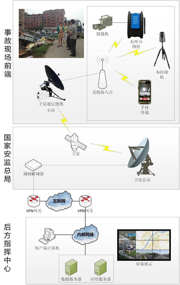 衛星系統現場端采用衛星通信便攜設備,可通過國家安監總局建設的亞洲7號通信衛星系統實現衛星網絡落地,再通過互聯網VPN鏈路(京津安全生產應急聯動協同平臺試點建設項目完成)實現總局端與廊坊市安監局的網絡連接。